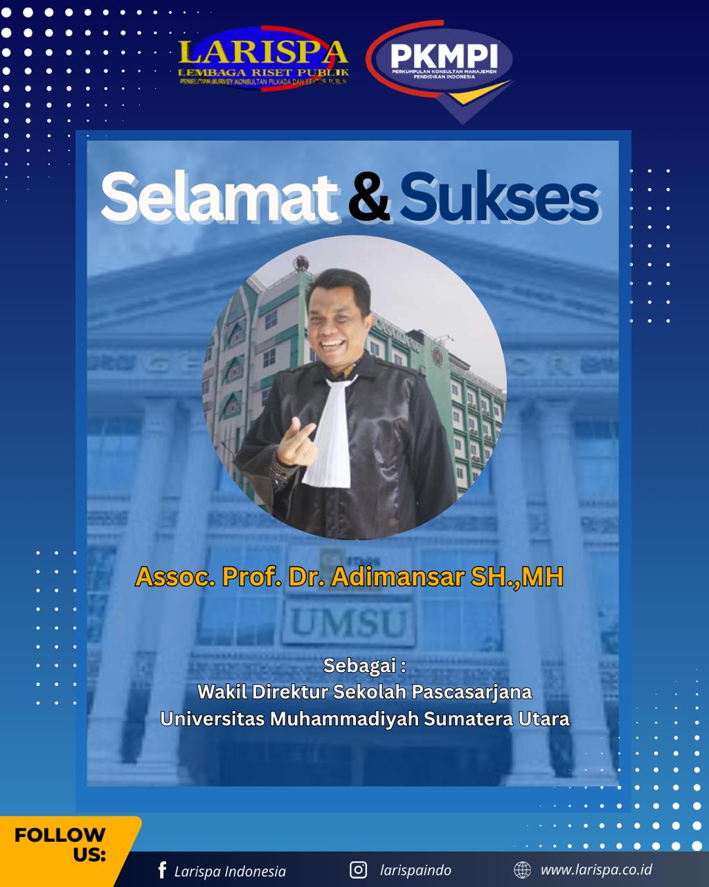 Keluarga besar LARISPA (Lembaga Riset Publik) dan PKMPI (Perkumpulan Konsultan Manajemen Pendidikan Indonesia) mengucapkan selamat dan sukses kepada Assoc. Prof. Dr. Adimansar SH.,MH atas amanah sebagai Wakil Direktur Sekolah Pascasarjana Universitas Muhammadiyah Sumatera Utara